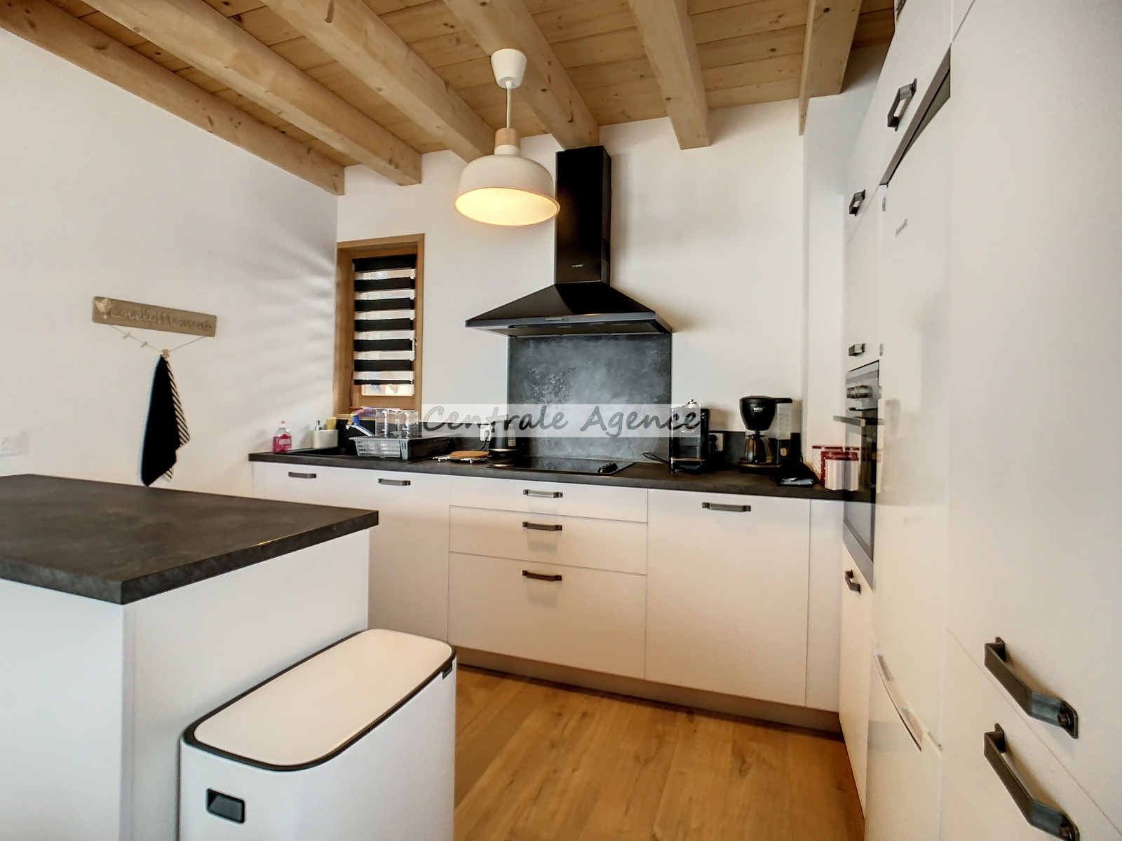 Au rez de chaussé, une grande cuisine ouverte entièrement équipée, une grande pièce à vivre avec accès balcon, poêle à pellet.